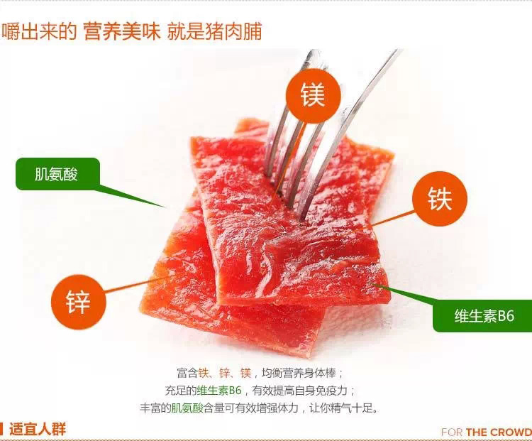精品美味豬肉脯是一款以上等的豬后腿肉為制作原材料的采用先進的加工工藝精制而成的美味與營養兼具的美食產品。美味豬肉脯是一種豬后腿肉經過去皮、去膘以及去除筋骨后的整塊瘦肉為基本原材料,將這種材料加工成比較薄的片狀的精品豬肉脯。再將白糖、味精以及特級魚露等各種佐料均勻涂抹其上,最后將這種待加工的材料放入專用的烤制設備進行烤制。在制作過程中,因采用先進的加工設備,因而能夠對佐料的量進行嚴格的把控,還能對烘烤的溫度進行科學的調控,生產出優質的精品美味的自制豬肉脯。